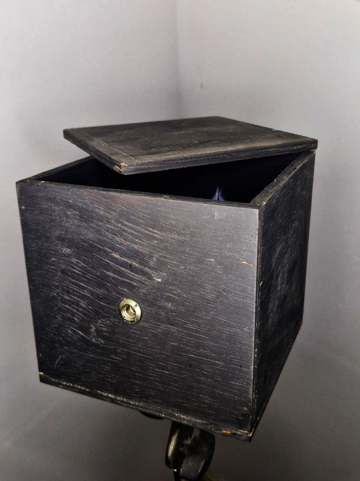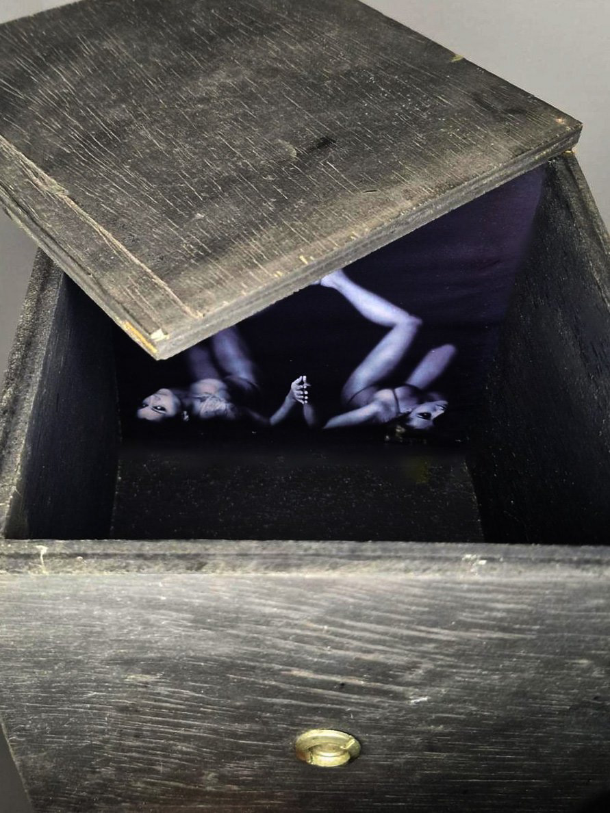 The installation consisted of five wooden cubes, measuring 20cm X 20cm X 20cm, completely closed, with a peephole in each one. Through these peepholes, visitors could observe images of people “enclosed” inside these small black boxes. The photographs inside the cubes were illuminated by battery-powered LED lights.