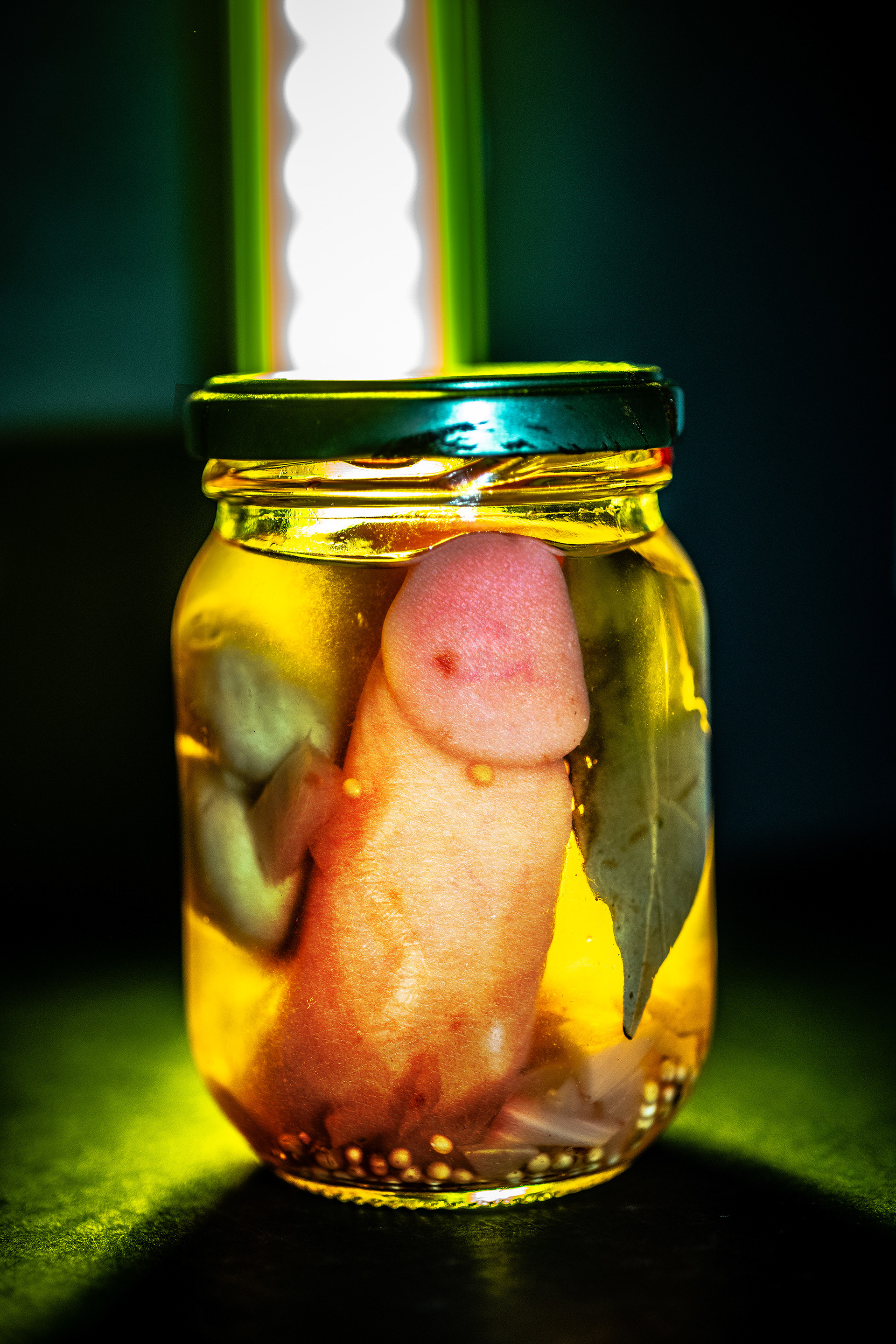 Para realizar essa obra — que, em resumo, é uma fotografia de produto — comecei produzindo o próprio objeto retratado: o vidro com o pênis em conserva. Esse processo incluiu diversas tentativas, erros e acertos, até que encontrei a textura ideal para o líquido e o protótipo em látex. Precisei montar a composição algumas vezes, pois utilizei sangue cenográfico, que acabava deixando a mistura muito turva.